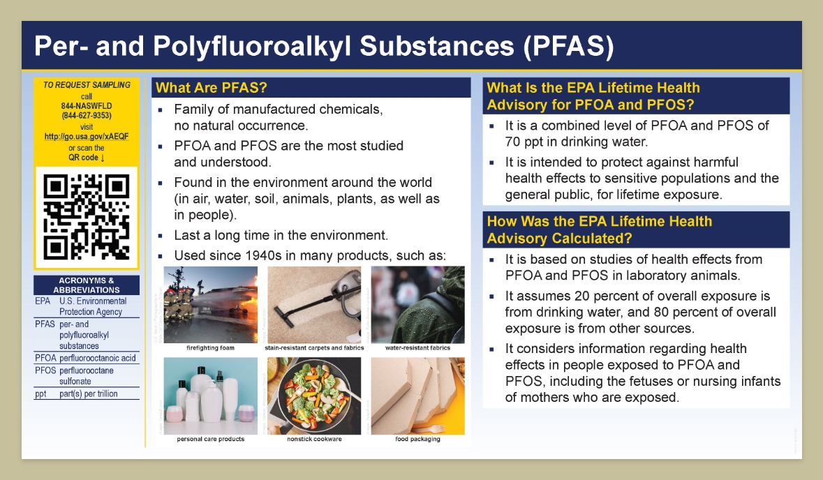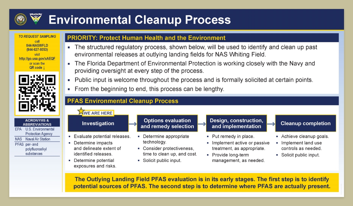 Welcome and thank you for your interest in the PFAS Drinking Water Well Investigation. This video is designed to be a summary of several topics related to the investigation including information about the Navy’s PFAS sampling policy, on-base PFAS investigation, current off-base drinking water well investigation, PFAS and potential health effects, and lastly the upcoming sampling process and timeline. This video provides an overview for outlying landing fields located in Florida and specific information for each of the outlying landing fields can be found at the links below. Thank you for understanding as we use the online forum as an alternative to an in-person open house meeting, due to COVID-19 concerns.